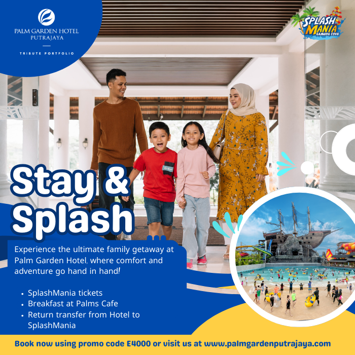 Stay in Palm Garden Hotel Putrajaya's cozy Family Room and let the kids enjoy endless fun at SplashMania Waterpark. With day park tickets, breakfast, and return transfers included, everything is taken care for you.